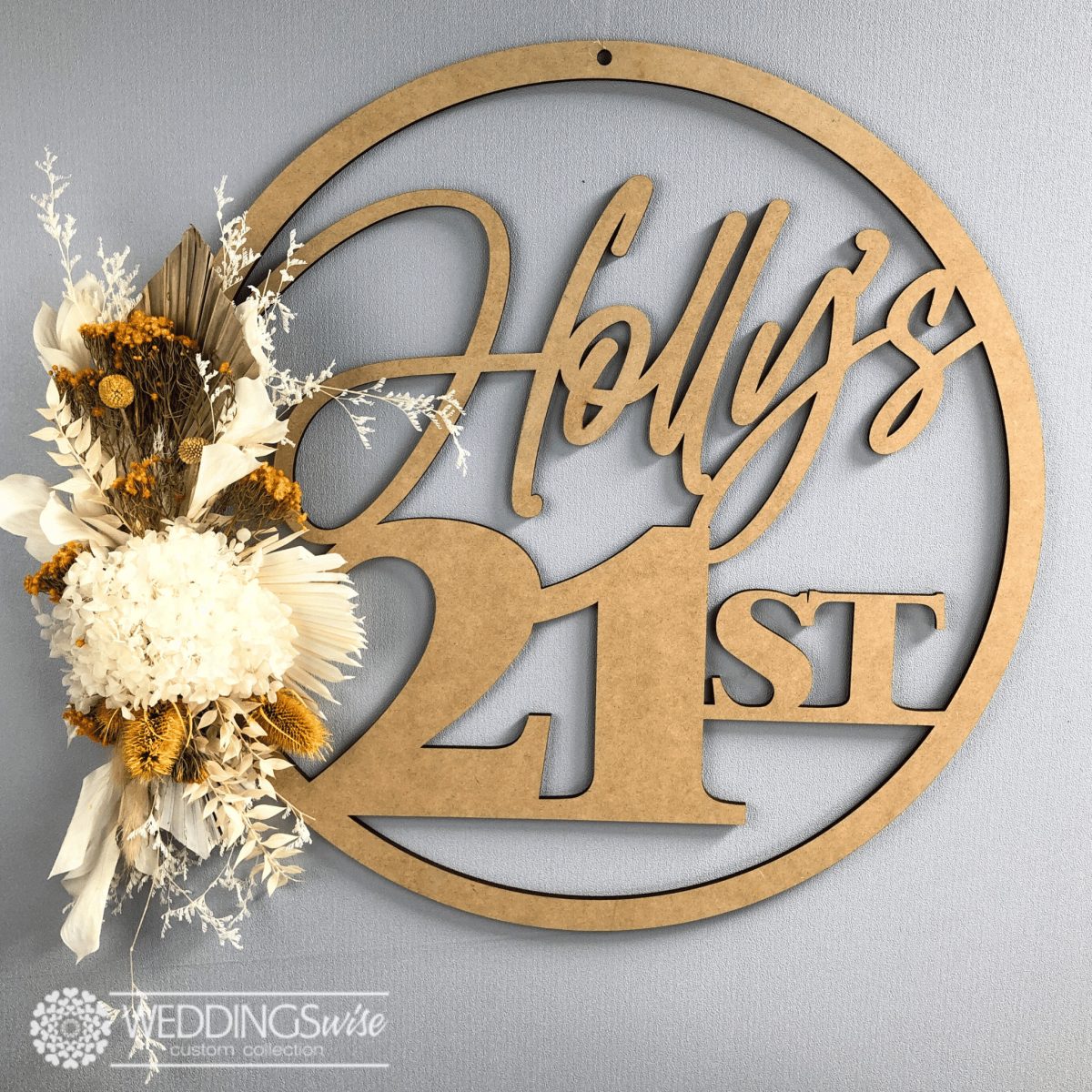 Our word rings are the perfect event signage! Customise your colour to suit your theme and create your home decor item, gift or even a great feature backdrop for a birthday! Our 21st personalised name birthday word ring can be customised in timber or Acrylic (white, black, silver, gold, rose-gold) and personalise with your name creating the perfect gift or  keepsake for a significant birthday.
