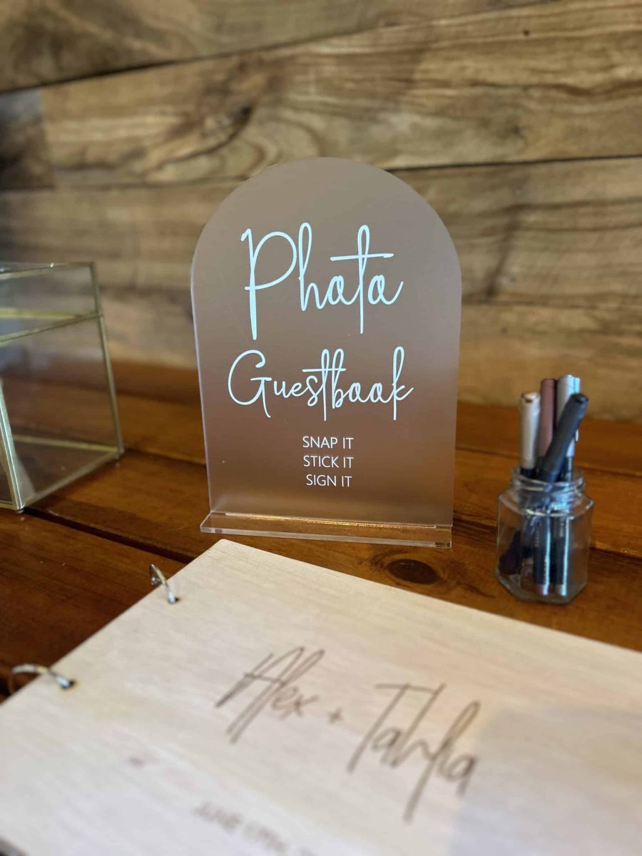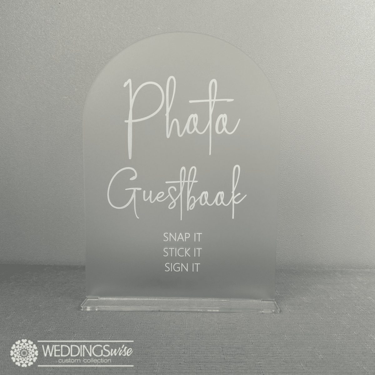 Guide guests to you guest book and give instructions about what to do to document their special day with this new arch acrylic “Guest book”  signage. Customise your signage with black, white or frosted acrylic and either with black or white writing to match your wedding theme. Celebrate your special day in style.