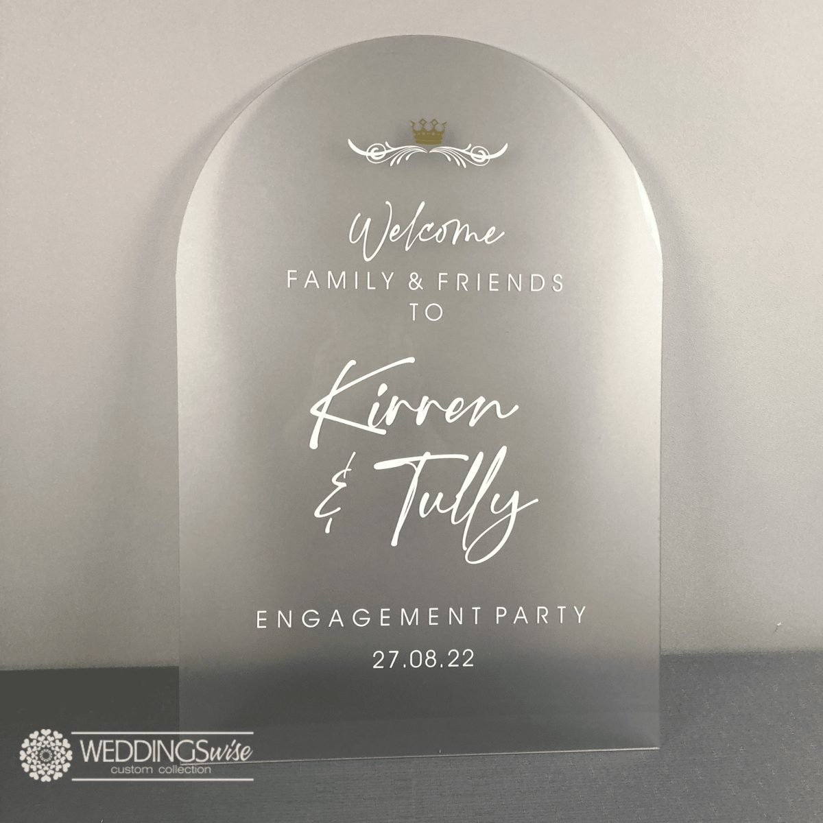 Frosted Arch Acrylic Engagement / Wedding Sign, perfect for a gorgeous wedding day or engagement party and a lovely way to welcome your guests as they arrive. Delight and impress your wedding guests by taking a little time to create your own unique wedding welcome sign, customise your colours and materials. This beautiful customised sign can be placed at the entrance table of your wedding ceremony, easel or reception area. It can also be used as an accent piece in your home as a keepsake of your special day.