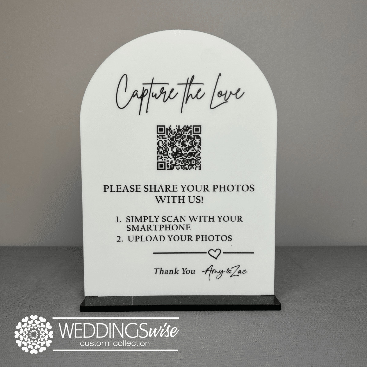 Capture the love, QR Code Sign – Acrylic Arch with Stand