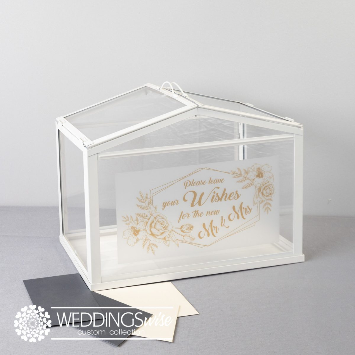 Product has hinged sides to allow an opening on top for your guests to be able to deposit their cards.