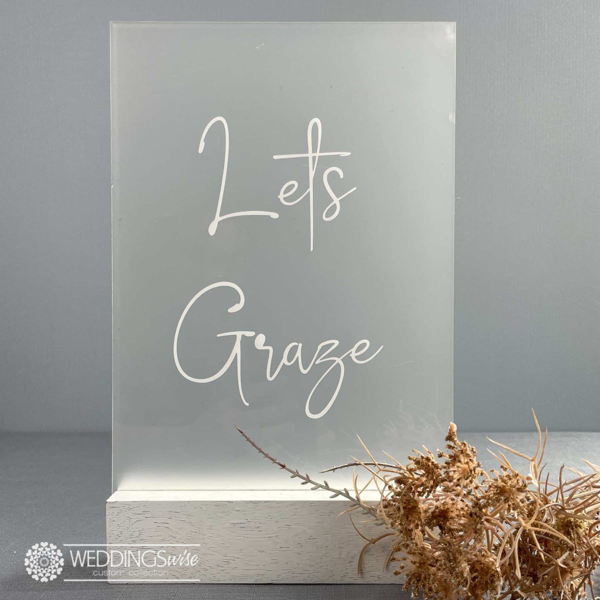 Stylishly show where guests where the are able eat and relax at your reception with this A4 acrylic “lets Graze”  signage. Customise your signage with clear or frosted acrylic and either with black or white writing to match your wedding theme. Celebrate your special day in style.