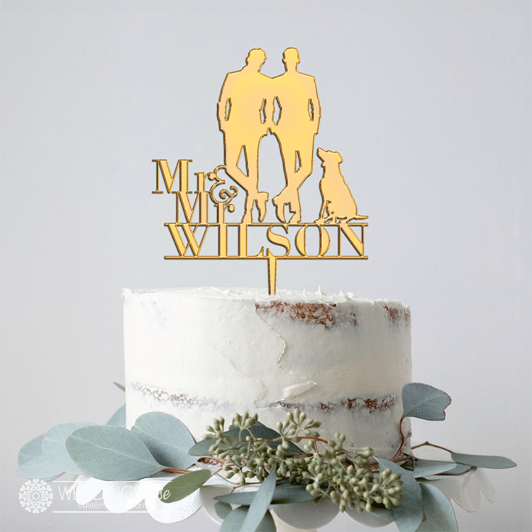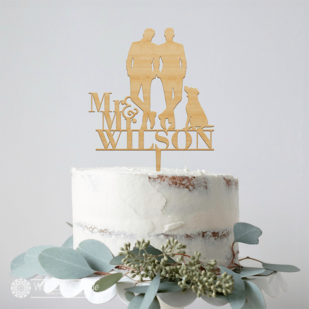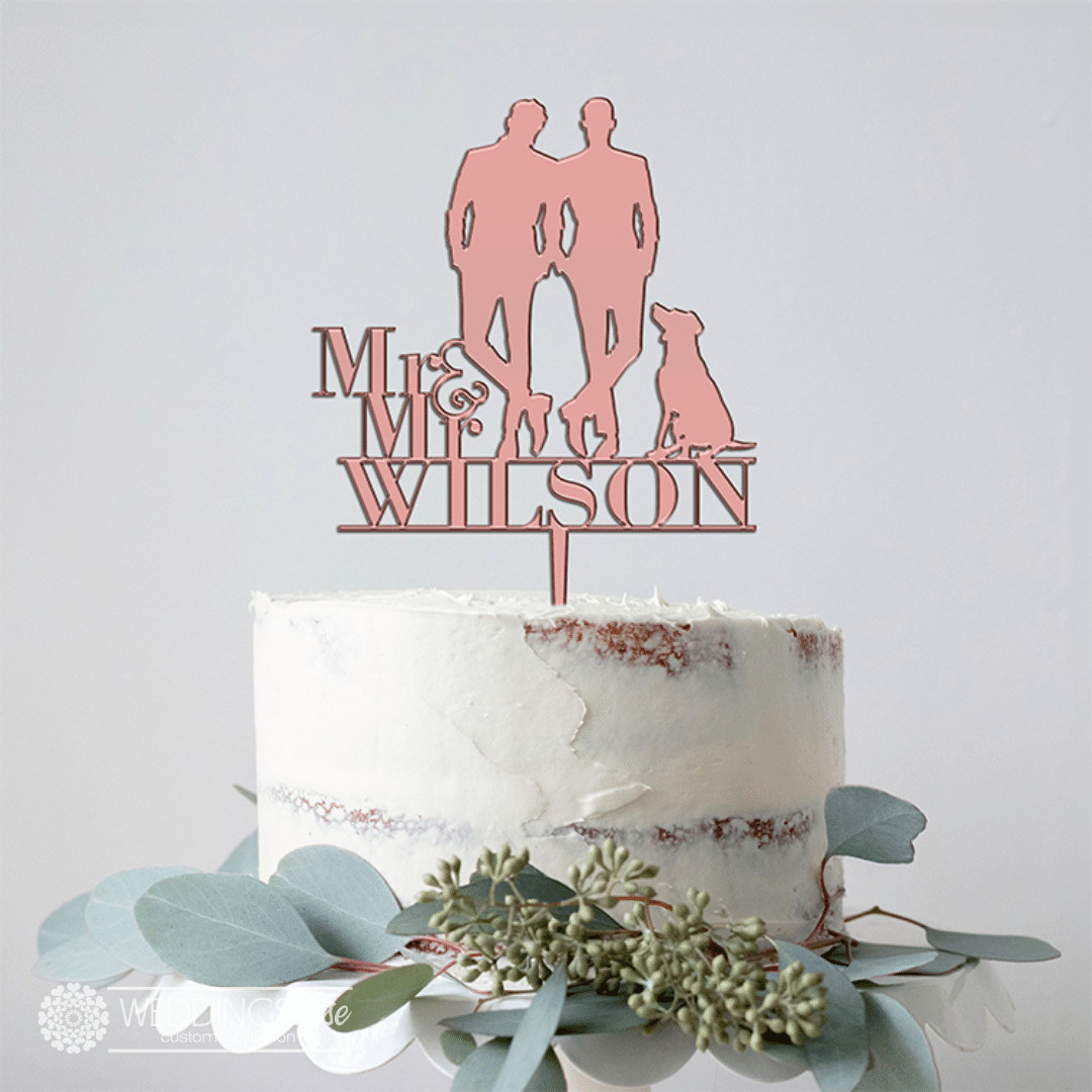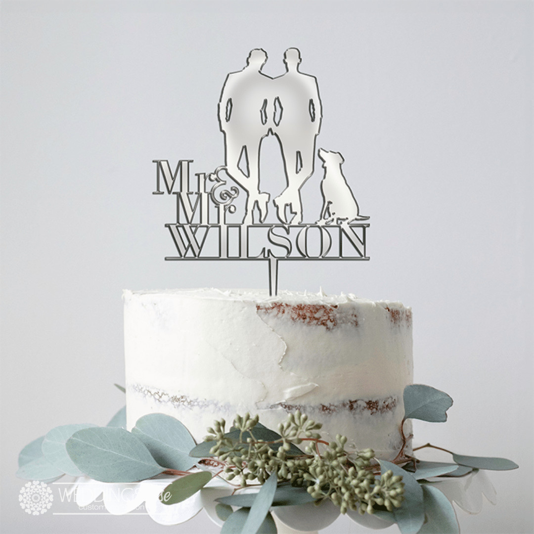 “Mr and Mr Silhouettes with Dog” Cake Topper- Personlised LGBTO + Wedding Decor