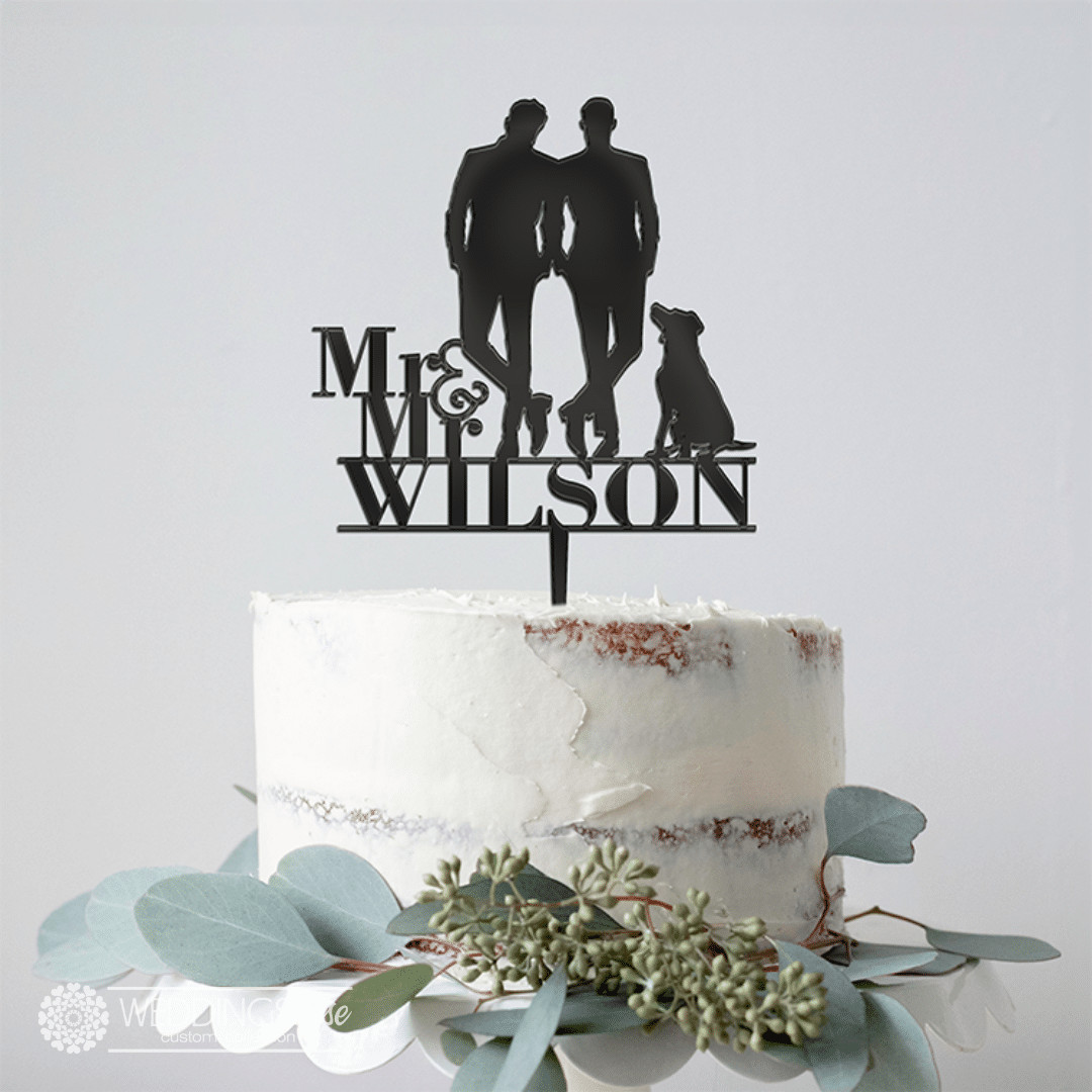 Mr and Mr Silhouettes with Dog Cake Topper – Personalised LGBTQ+ Wedding Cake Decor