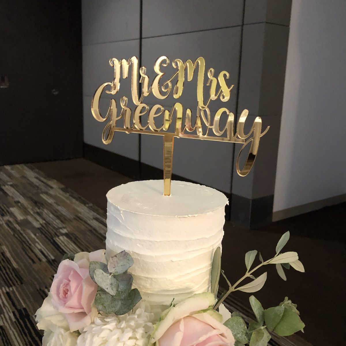 Available in a variety of finishes—including timber, gold mirror, rose gold mirror, silver mirror, black acrylic, and white acrylic—this lightweight topper complements all wedding styles, from classic and romantic to modern and chic. A beautiful addition to your cake and a lasting memento of your special day.