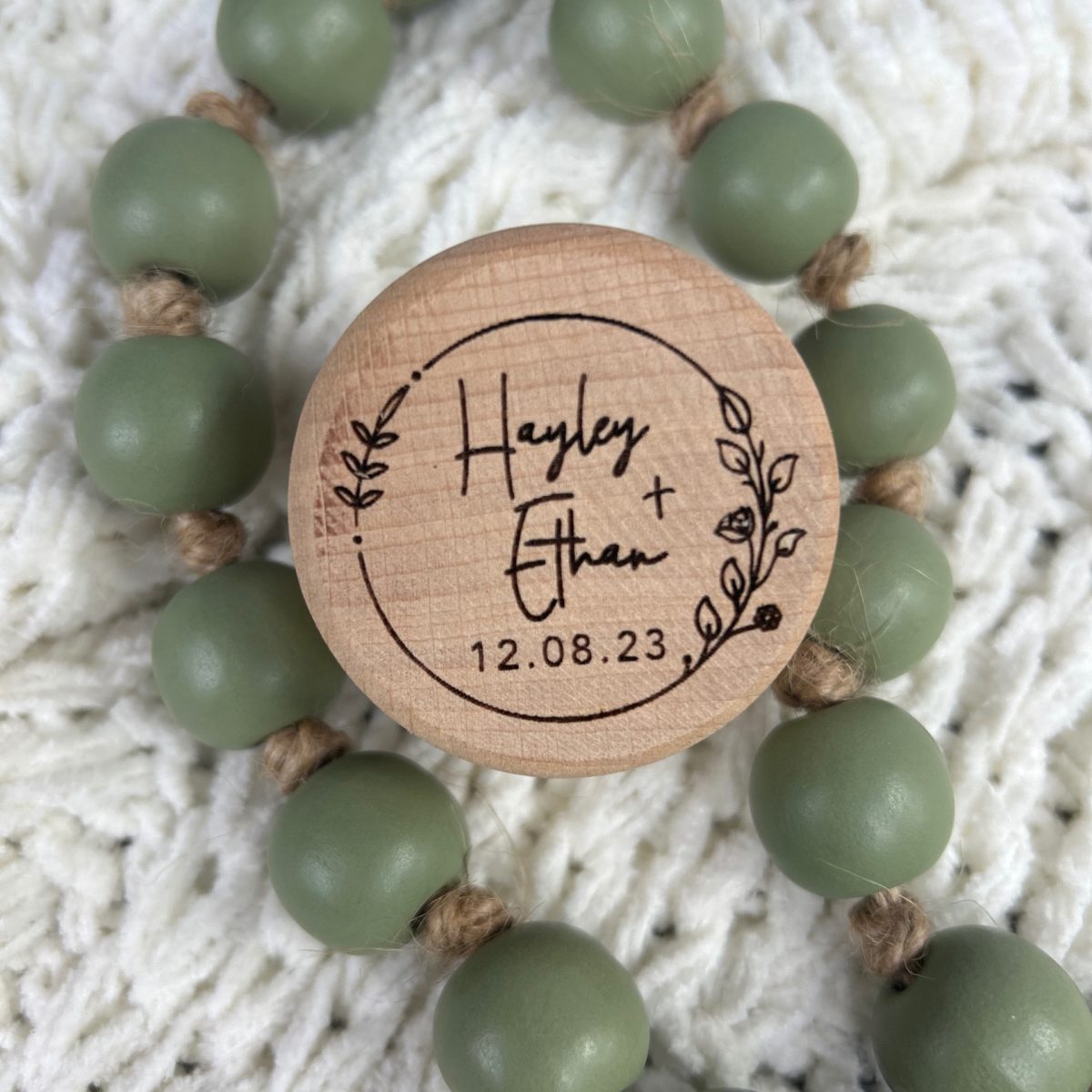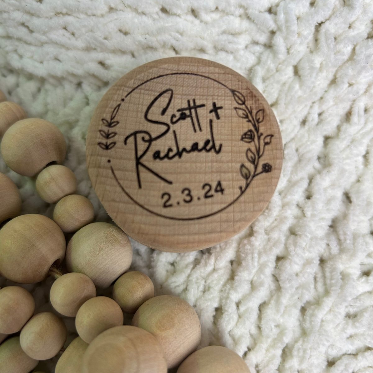 Celebrate your special day with our Personalised Flower Wreath Timber Ring Box – Custom Names & Wedding Date, a beautifully crafted keepsake designed to hold your wedding rings safely and stylishly. Made from natural timber and laser engraved with both names and your wedding date, this unique ring box adds a romantic and personalised touch to your ceremony.Featuring a delicate floral wreath illustration and a soft jute insert, this ring box is perfect for ring bearers, flat-lay photography, proposal moments, and wedding day styling. Its timeless round design complements boho, rustic, garden, romantic, and modern wedding themes, making it a cherished keepsake long after the celebration.