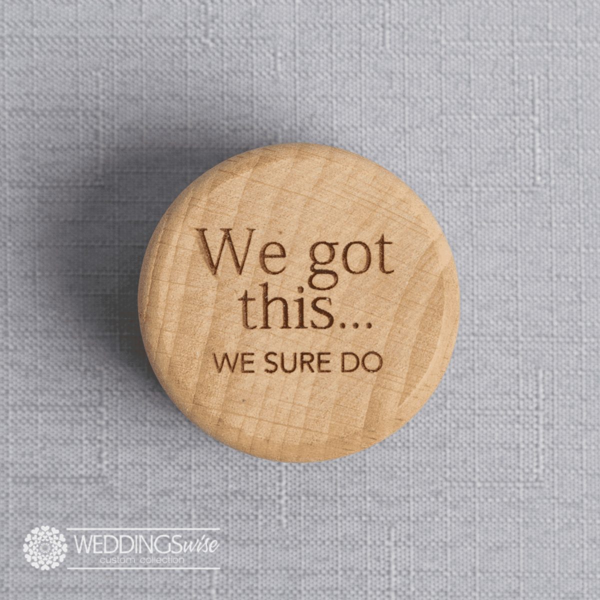 Celebrate your special moment with our “We Got This… We Sure Do!” Timber Ring Box – Engraved Wedding Keepsake. Crafted from natural timber and engraved with the uplifting phrases We got this… and We sure do, this charming ring box adds personality and meaning to your ceremony. The smooth round timber design keeps your rings safe and beautifully presented for your ceremony, ring bearer, or wedding photography. Its classic wording suits all wedding styles—modern, rustic, elegant, romantic, minimalist—and becomes a treasured keepsake long after the big day.