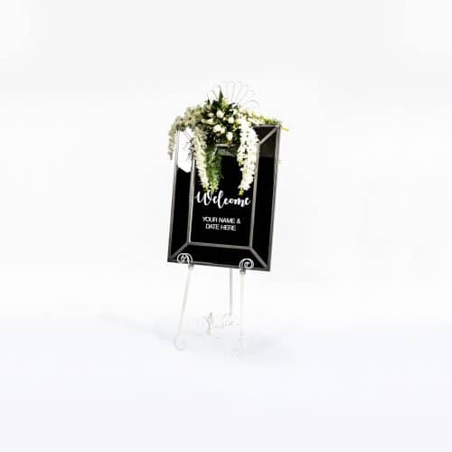 Some Wedding trends come and go, while others stick around for the long haul. One wedding decor that is not going anywhere is wedding mirror signs, they are here to stay. A framed mirror bearing your wedding details is the perfect vehicle for all your wedding signage. Hire our 63cm x 83cm “Welcome” silver mirror sign with easel and personalise with your chosen font for your names and date. The perfect way to welcome your guests to your special day.